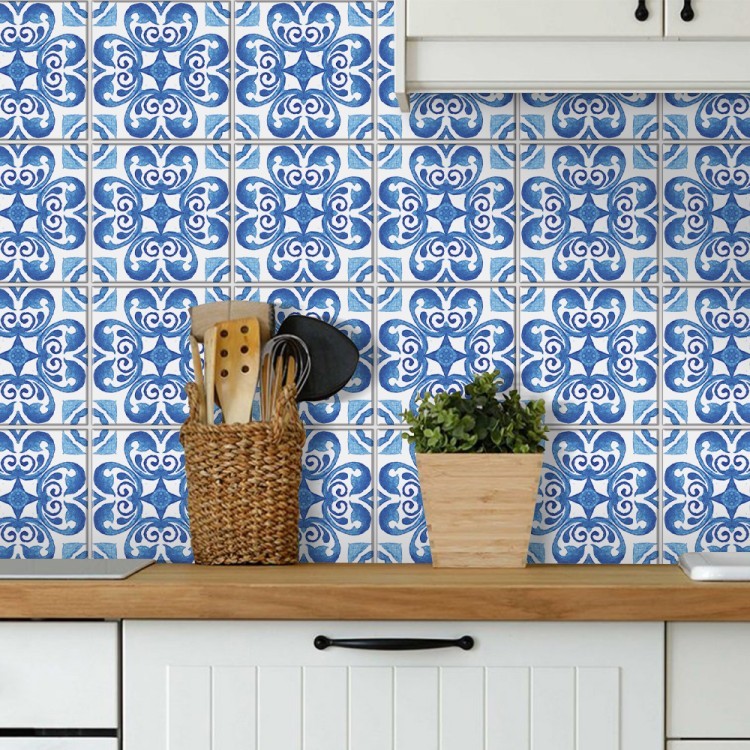 Αυτοκόλλητο backsplash, Πορτογαλικό ισπανικό μοτίβο ανοιχτό μπλε.Το μοτίβο είναι φτιαγμένο από ένα ξεθωριασμένο μπλε, ζωγραφισμένο στο χέρι.