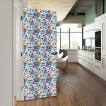 Ένα μαγικό μοτίβο από μπλε και μαύρα τρίγωνα μαζί με ροζ και πορτοκαλί λουλούδια σε άσπρο φόντο.