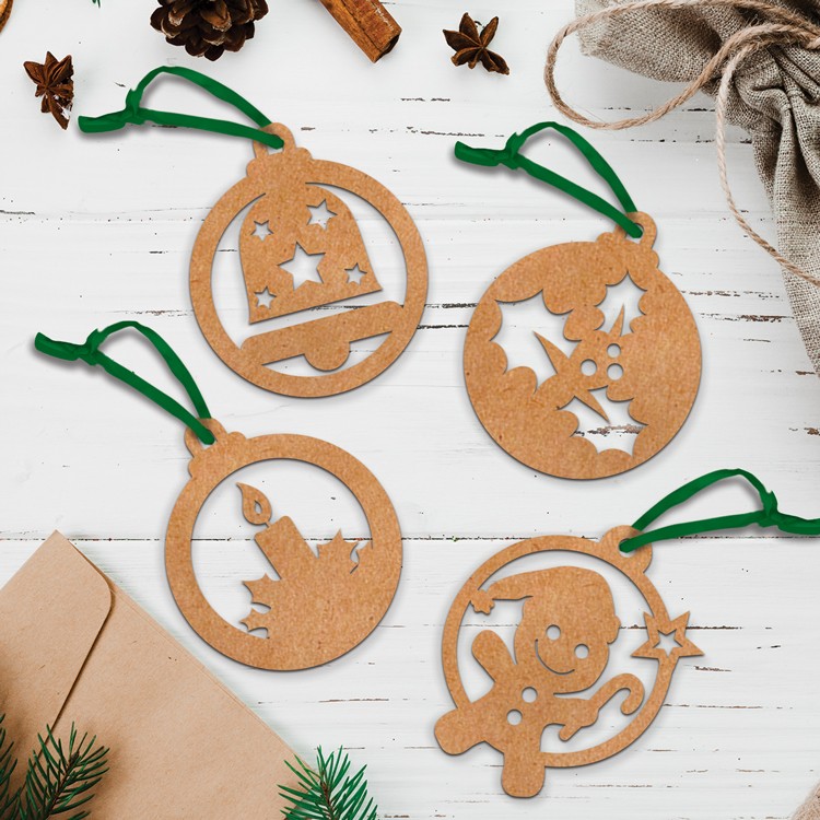 Τα στολίδια κόβονται από ξύλο πάχους 4mm ή απο plexy glass 3mm και μπαίνουν σε ξύλινο κουτί για αποθήκευση ή σε σάκο από σελοφάν.